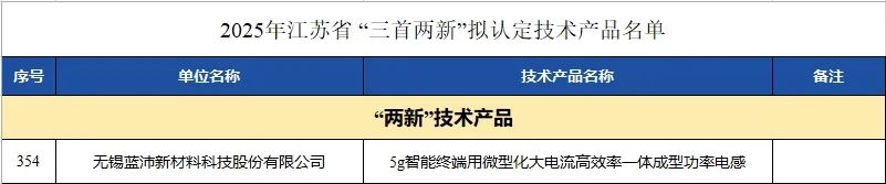 近日,江蘇省工信廳公示了2025年度江蘇省“三首兩新”擬認(rèn)定技術(shù)產(chǎn)品名單,無錫藍(lán)沛新材料科技股份有限公司產(chǎn)品“5g智能終端用微型化大電流高效率一體成型功率電感”位列“兩新”技術(shù)產(chǎn)品名單之中。